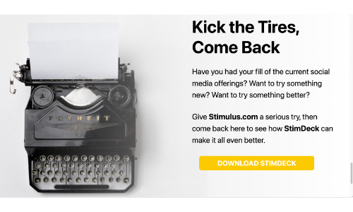 StimDeck is a heads-up display (HUD) for Stimulus.com that allows users to view several feeds simultaneously. Due to technical constraints, stimdeck is not a web app. It’s a desktop application that pulls the site’s live content into what are basically mobile-friendly, narrow columns that can be viewed side-by-side.